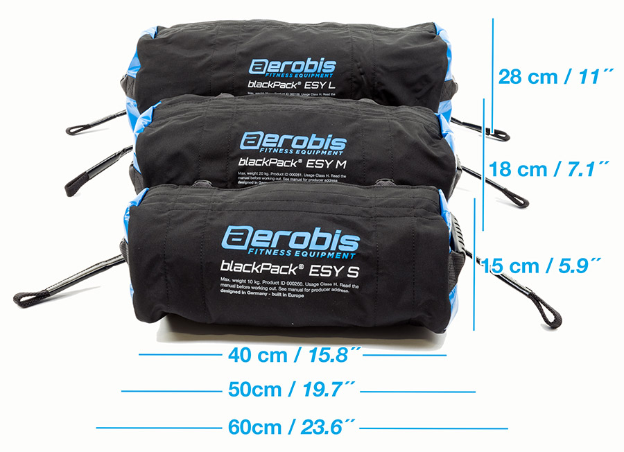 Auf den ersten Blick könnte man den Sandbag blackPack® ESY* für den kleinen Bruder des blackPack® PRO halten. Doch wird diese Beschreibung dem neuentwickelten Sandbag von aerobis nicht in allen Punkten gerecht. Der blackPack ESY verzichtet auf jeglichen Zierrat. Im Vordergrund steht seine Funktionalität. Deshalb wurde das Design betont schlicht gehalten. Auch die Konzeption des blackPack ESY ist etwas einfacher gestaltet als beim blackPack Pro. Im Unterschied zu diesem Sandbag lässt sich das Modell ESY nicht zusätzlich komprimieren. Dadurch bewegt sich der Inhalt stets frei, was das Trainieren mit dem blackPack ESY ganz automatisch instabiler gestaltet. Druck-, Zug- und Schwingübungen werden somit zu einer echten Herausforderung. Die drei mitgelieferten Loadingsbags SAND kann man mit Sand oder Kieselsteinen füllen, und das Volumen zusätzlich mit leichtem Füllmaterial wie Luftpolsterfolie regulieren.
